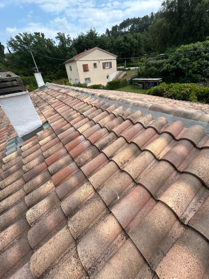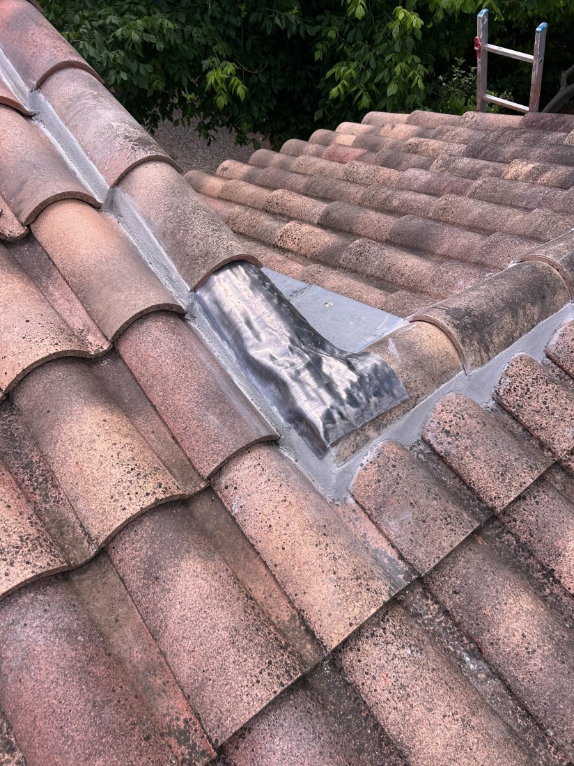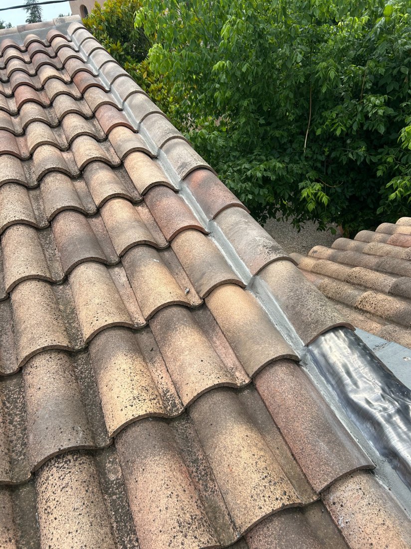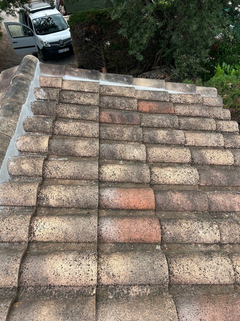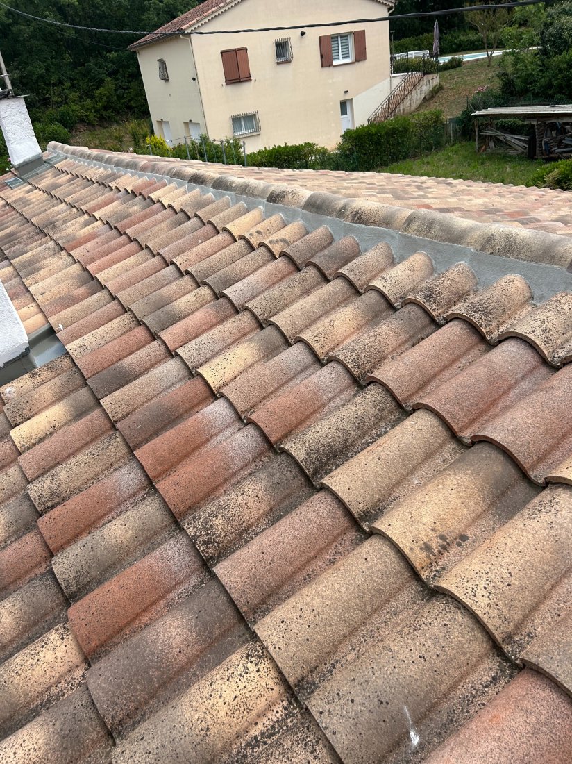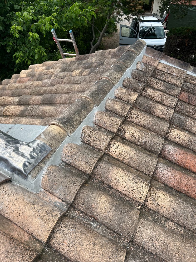 La problématique rencontrée sur ce chantier était principalement liée à l'usure avancée des rives existantes et à un mauvais écoulement des eaux. Le vieux mortier, devenu poreux, n'assurait plus une protection suffisante, ce qui pouvait entraîner des infiltrations et un décollement des tuiles en bordure. De plus, l’exposition directe aux intempéries accentuait la fragilité de cette zone. Notre intervention a donc visé à retirer l'ancien mortier, à préparer minutieusement le support et à appliquer un nouveau cimentage parfaitement dosé, garantissant ainsi une adhérence optimale et une finition durable.