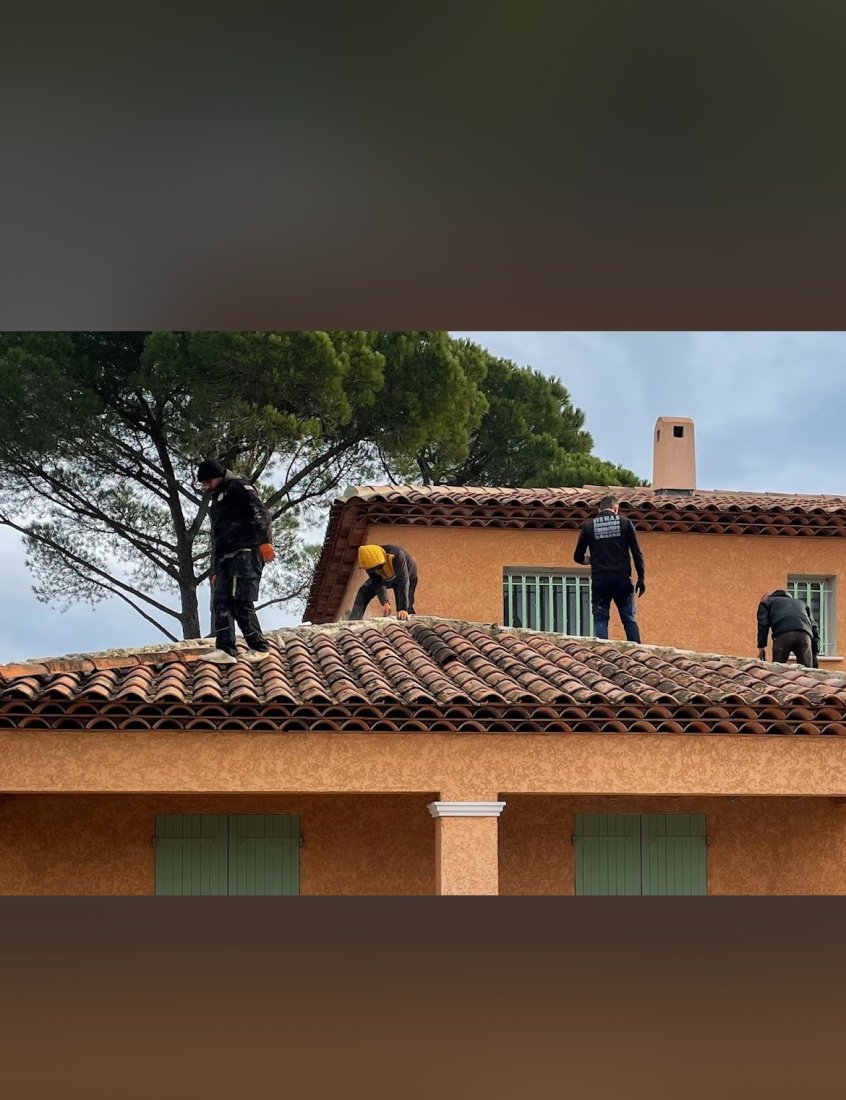 Photo d’un chantier de cimentation de rive à Vidauban réalisé par MAS.Toiture : notre équipe de couvreurs s’active à renforcer et protéger la toiture pour une finition durable et esthétique.