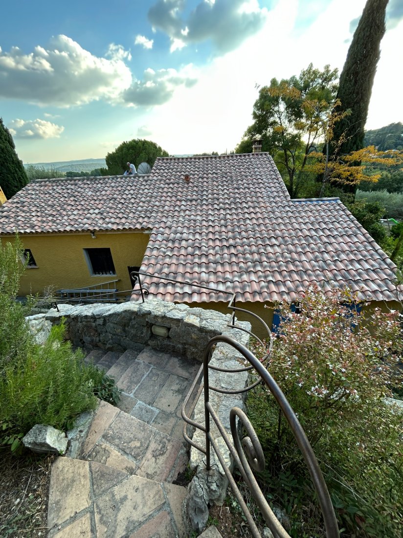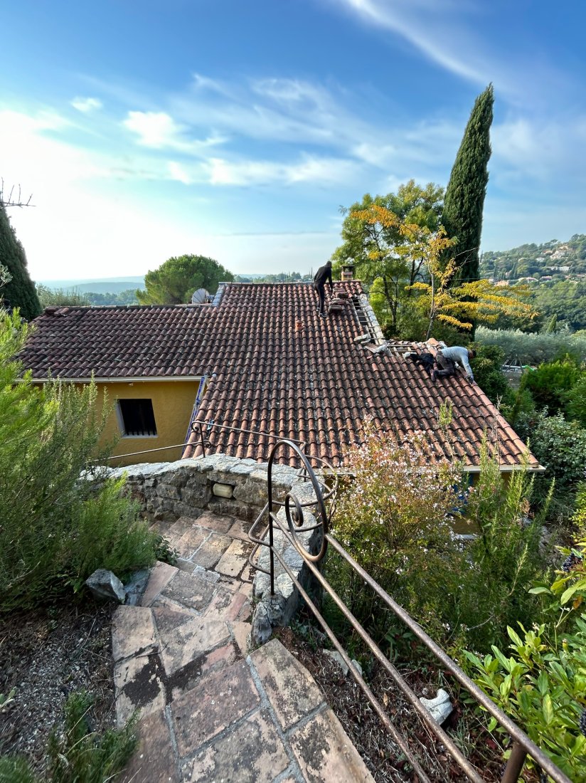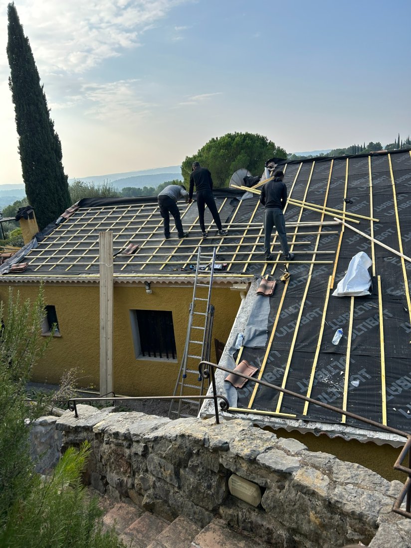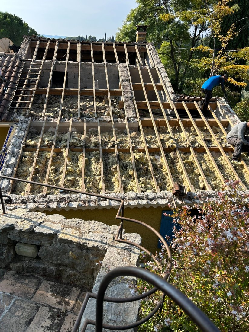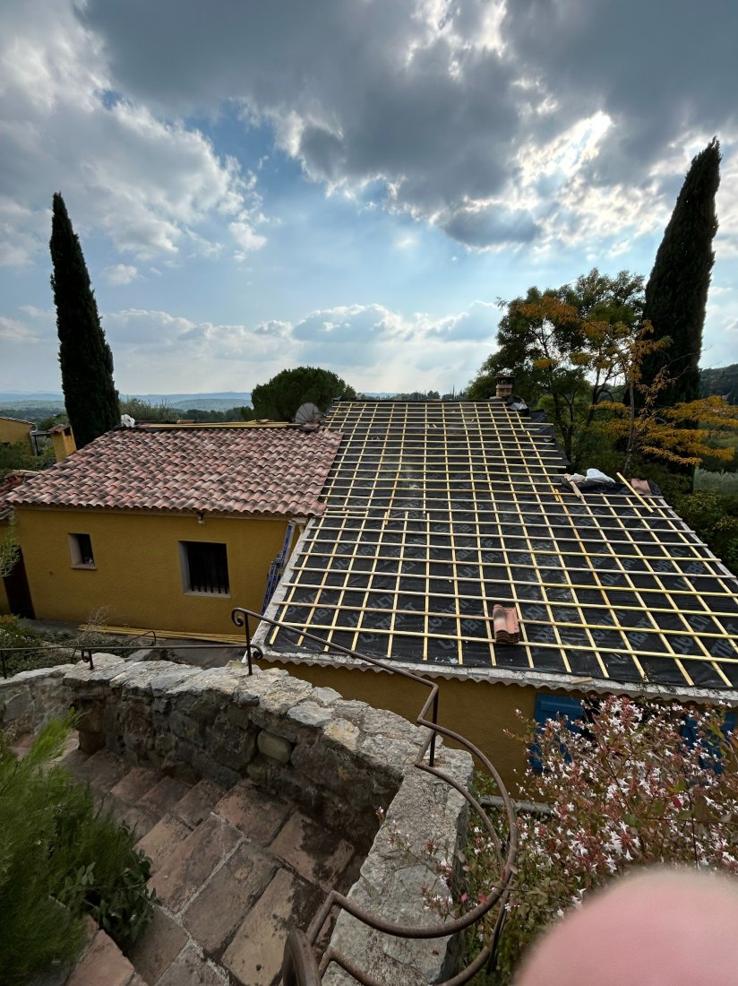 Photo d’un chantier à Cotignac : l’équipe MAS.Toiture procède au remplacement complet d’une toiture, assurant une couverture neuve et durable pour cette maison provençale, dans le respect des normes de qualité.